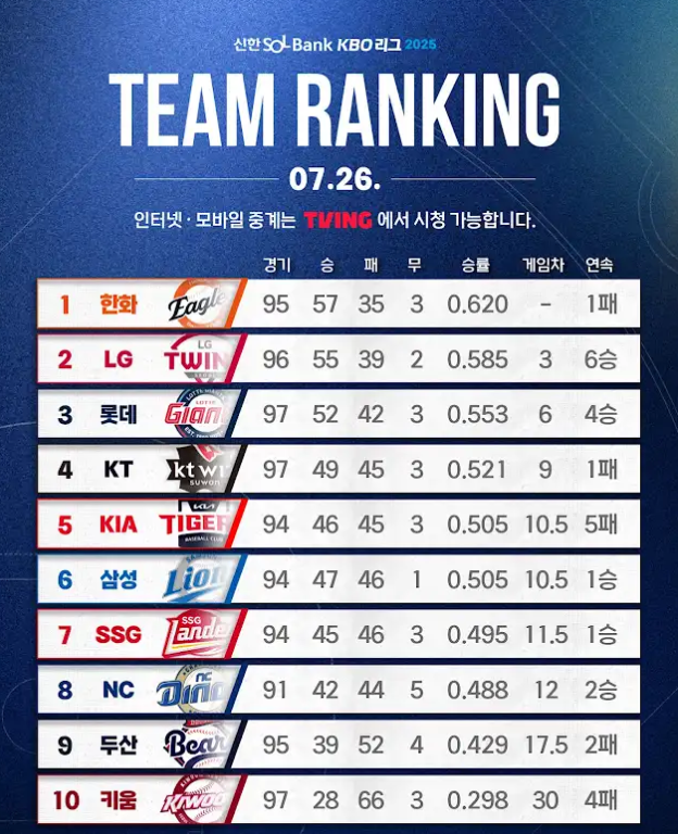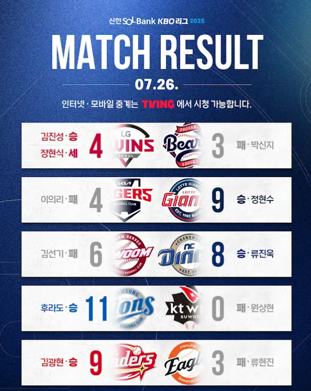 2025년 7월 26일 경기 종료 기준, KBO리그 순위표와 7월 26일 경기 결과입니다.