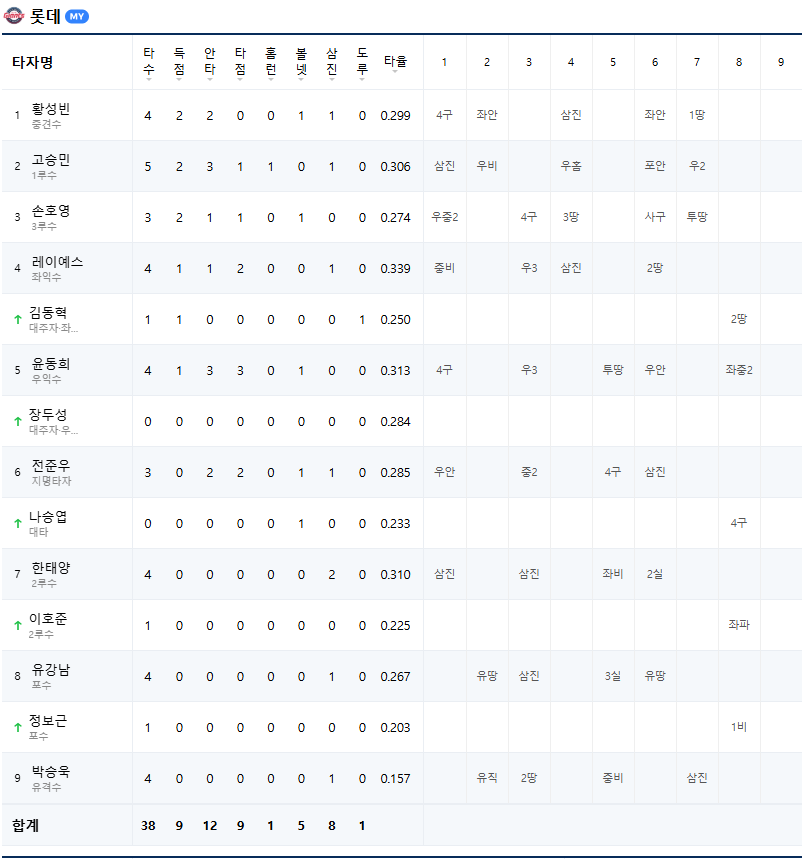 | 7회말 | 2아웃 상황에서 고승민이 우익수 오른쪽 2루타를 쳤지만, 손호영이의 투수 땅볼로 이닝이 종료되었다. |