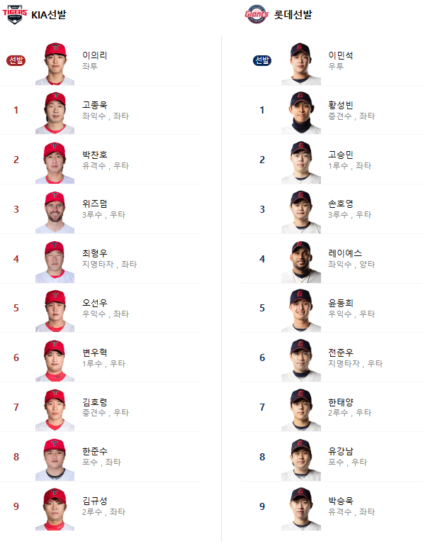 롯데 자이언츠 선발 투수는 이민석 선수입니다. 과연 이민석 선수가 KIA 타자 상대로 잘 처리하고 위닝 시리즈를 확보해 줄 지 기대가 됩니다.