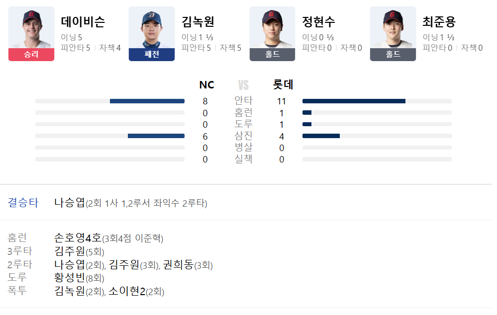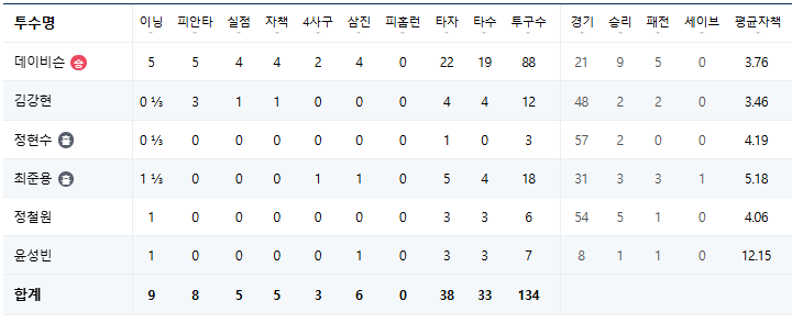 - 선발 투수 : 선발 투수인 데이비슨은 5이닝 동안 5피안타 4실점 4자책 2사구 4삼진을 기록하면서 다소 아쉬운 성적을 기록했습니다. 다행히 불펜들이 어떻게든 잘 막아줬고, 타선도 11점을 만들고 이 11점을 지켜내면서 승리 투수가 되었습니다.