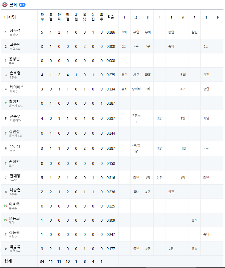 | 1회말 | 2아웃 상황에서 손호영이 유격수 앞 내야안타를 만들었지만, 레이예스의 유격수 뜬공으로 이닝이 종료되었다. |