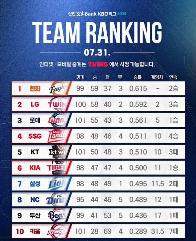 2025년 7월 31일 경기 종료 기준, KBO리그 순위표와 7월 31일 경기 결과입니다.