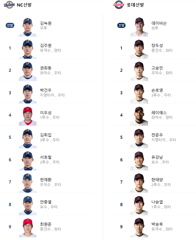 롯데 자이언츠 선발 투수는 데이비슨 선수입니다. 과연 데이비슨 선수가 NC 타자 상대로 잘 처리하고 위닝 시리즈를 만들어 줄지 기대가 됩니다.