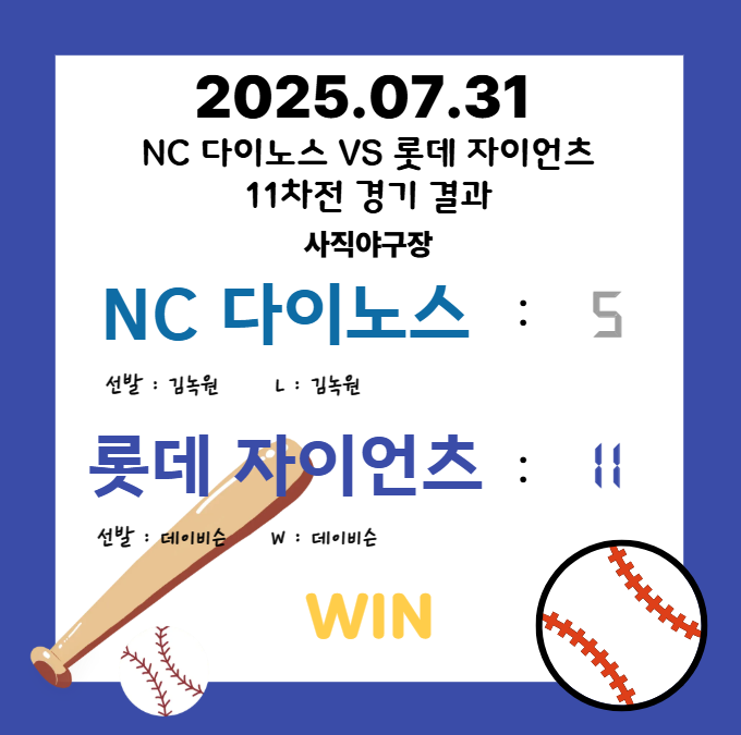 2025년 7월 31일 KBO 리그 NC 다이노스 VS 롯데 자이언츠 11차전 경기 리뷰 본문