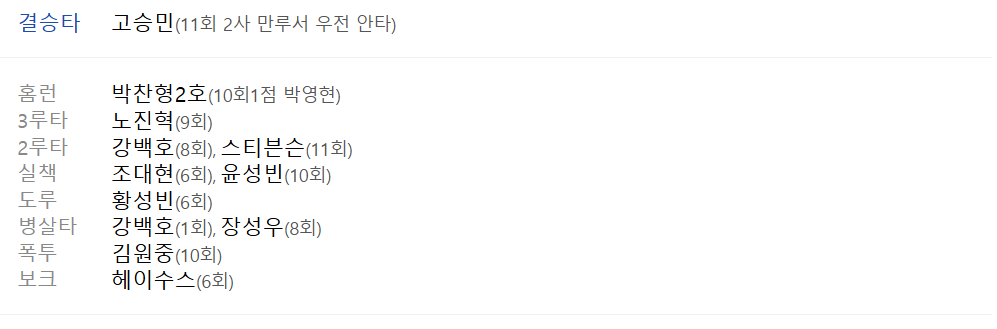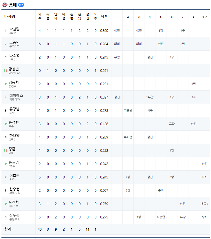 | 1회말 | 2아웃 상황에서 나승엽이 우익수 왼쪽 안타를 쳤지만, 레이예스가 긴 승부 끝에 헛스윙 삼진으로 아웃되면서 이닝이 종료되었다. |