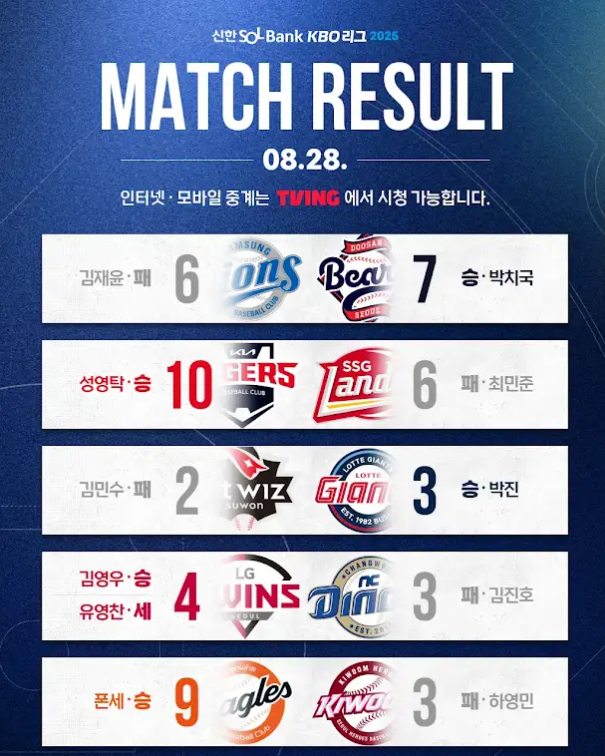 2025년 8월 28일 경기 종료 기준, KBO리그 순위표와 8월 28일 경기 결과입니다.