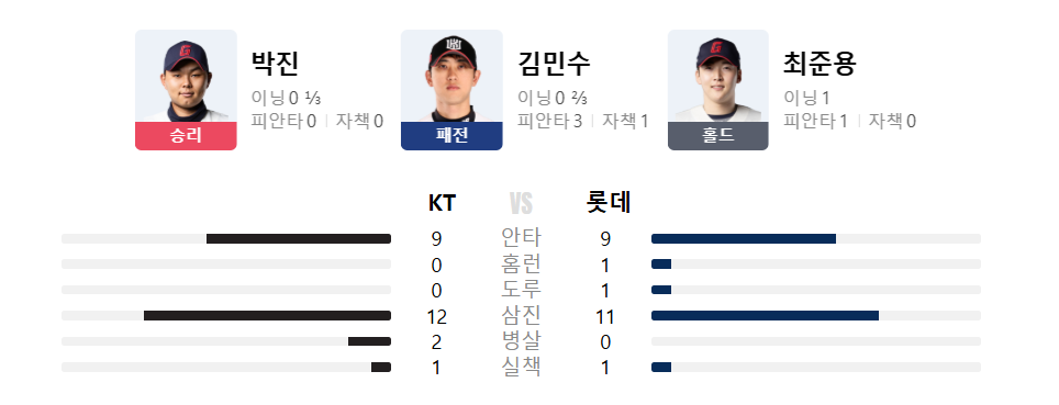 승리투수는 박진 선수가 되었습니다. 그리고, 최준용 선수는 홀드로 기록됩니다.
