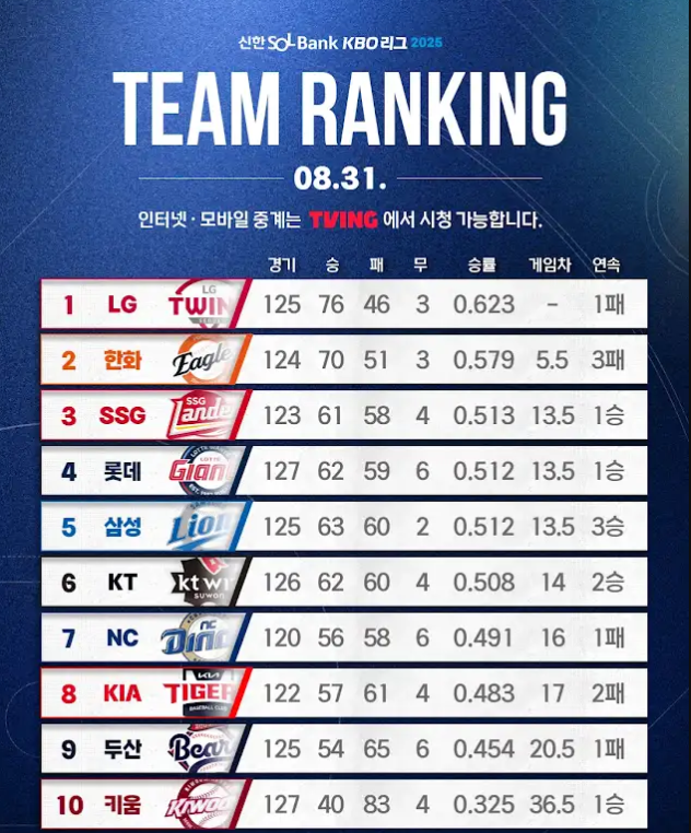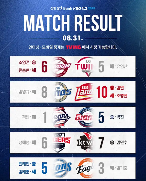 2025년 8월 31일 경기 종료 기준, KBO리그 순위표와 8월 31일 경기 결과입니다.