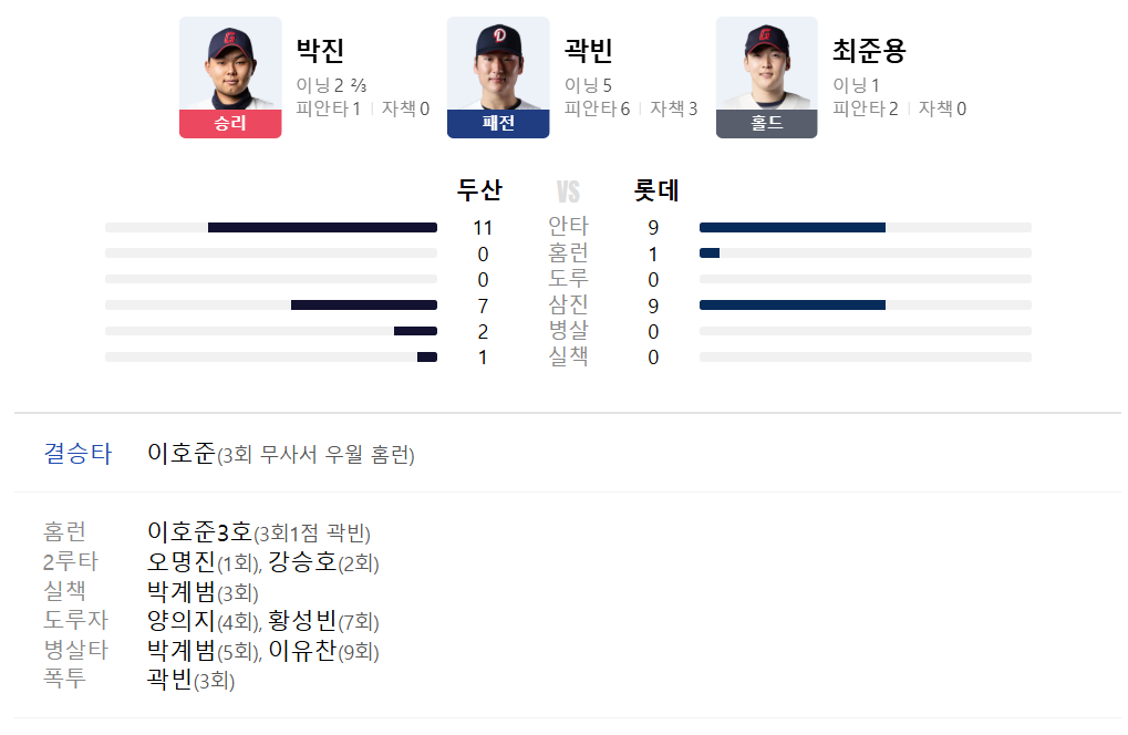 | 9회초 | 강승호랑 조수행 모두 초구 안타로 무사 1,2루를 만들었다. 하지만, 이유찬이 643병살타를 만들면서 2사 3루가 된다. 다음 타자인 김인태가 초구 안타를 치면서 두산이 9회에 1점 얻게 된다. 스코어 두산 1 : 5 롯데 하지만, 오명진이 헛스윙 삼진으로 아웃되면서 경기가 종료되었다. 최종 스코어 두산 1 : 5 롯데 |