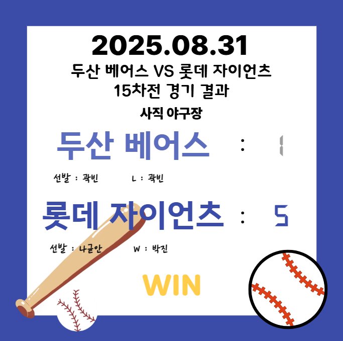 2025년 8월 31일 KBO 리그 두산 베어스 VS 롯데 자이언츠 15차전 경기 리뷰 본문